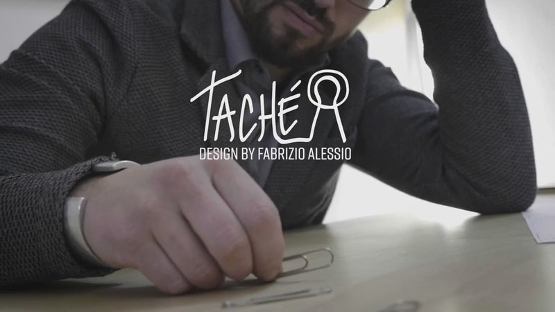 Taché, que en piamontés significa “unir”, es el soporte que transforma una simple bombilla G125 en una lámpara de mesa con un carácter único. Diseñado por el diseñador Fabrizio Alessio, se inspira en el histórico clip patentado por Middlebrook en 1899. Con la misma elegancia y ligereza, su estructura “pinza” el globo de la bombilla, dejándolo suspendido y como protagonista de la escena.
